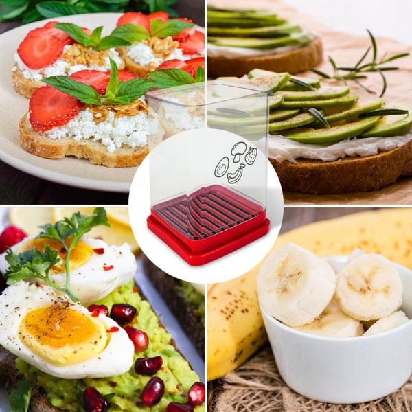 Food Slicer: This cup cutter can easily cut most daily foods (strawberries, bananas, eggs, mushrooms, cheese, butter, etc.). You only need to place the food on the bottom plate and press it with the cutting cup to complete the food cutting.
