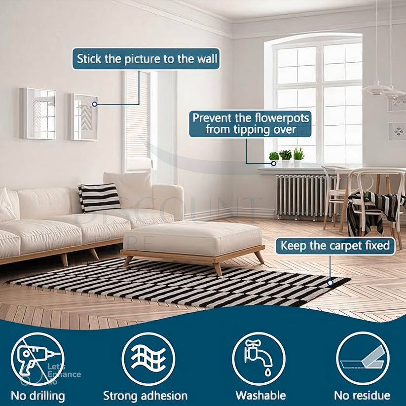 This double sided tape will stick to almost anything with a smooth surface so you can stick anything anywhere. You can use it to fix or paste items such as frames, carpets, power sockets and remote controls etc
